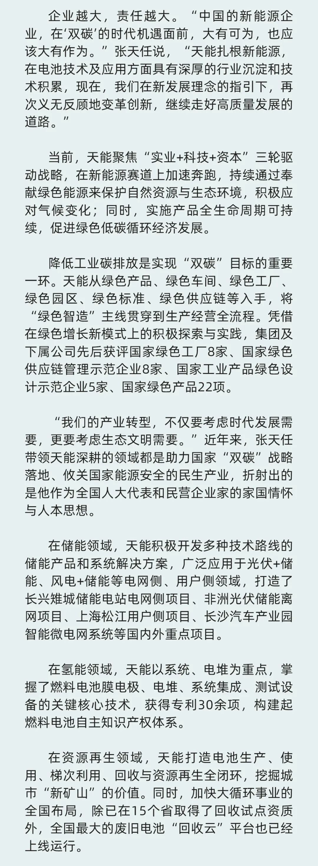 全国“两会”正在进行中,全国人大代表、333体育控股集团董事长张天任提出了高质量建设新型储能体系、尽快出台强有力氢气补贴、加强回销一体化示范项目推广、鼓励各类电池技术平行发展等具体建议,为推动能源转型,守护绿水青山积极建言献策。